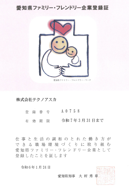 2024年01月24 日に【愛知県ファミリー・フレンドリー企業】に認定されました! 愛知県ファミリー・フレンドリー企業とは、社員が仕事と生活の調和を図ることができる職場環境づくりに積極的に取り組んでいる企業のことで、 ワーク・ライフ・バランスの実現に取り組む企業として愛知県より認定を受けることができました。 ワーク・ライフ・バランスとは、単に仕事とと生活に割く時間を半々にするということではなく、 それぞれの人が仕事の責任を果たしつつ、「仕事」と「仕事以外の生活」との調和を図り、その両方が充実している状態のことで、 テクノアスカでは、若者から子育て世代、中高年まで、全ての世代の社員が働きやすい環境であるよう、 時差出勤制度や、短時間勤務制度、子の看護等休暇制度、在宅勤務制度などの制度の策定や、 年次有給休暇の取得促進やメンタルヘルス対策等様々な視点から働き方の改善を行っています。