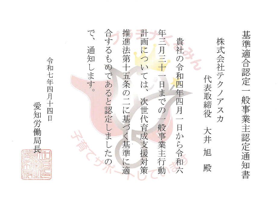 2025年04月21日に【プラチナくるみん】を取得しました! プラチナくるみんとは、くるみんを取得している企業の中で、 より高い水準の取組を行い一定の基準を満たしている優良な「子育てサポート企業」のみが取得することができる制度です。 テクノアスカでは、2020年ににくるみんを取得、 その後も、積極的に子育て支援を行った結果、「プラチナくるみん」を取得することができました! 実際に2025年度には男女ともに育休取得率100%を達成、 育休後も短時間勤務や子の看護休暇を利用しつつ仕事と家庭を両立している社員が多く在籍しています!